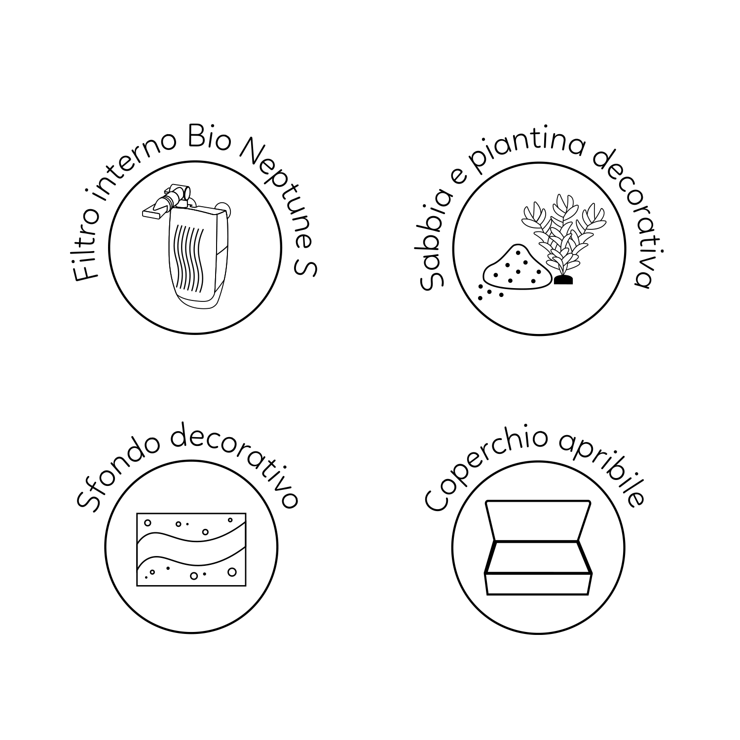 L’acquario ha una capienza di 20 litri lordi, corredato di filtro interno regolabile, una piantina in plastica, una confezione di sabbia e uno sfondo scenografico.