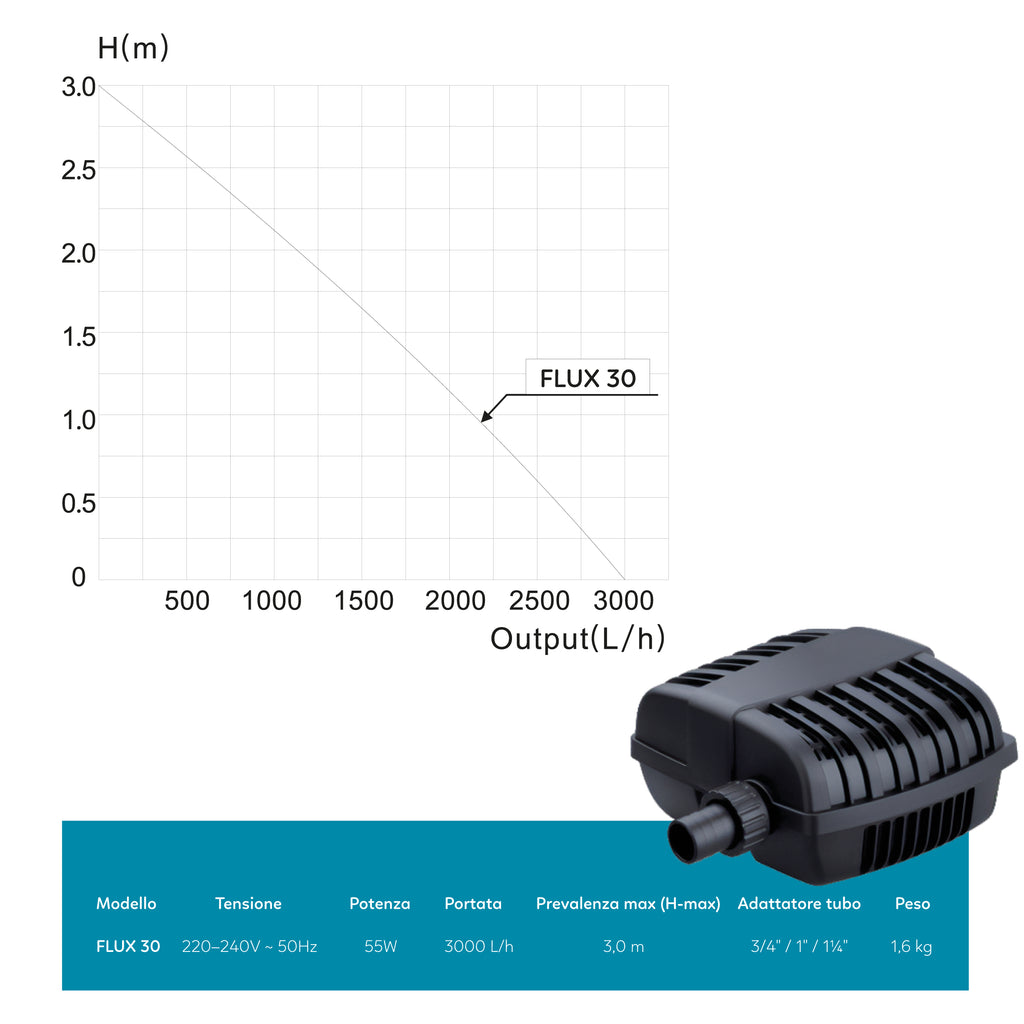 Ampia gamma di portate: scegli la versione Flux 30 o Flux 80 in base alla capacità e alle esigenze del tuo laghetto.
